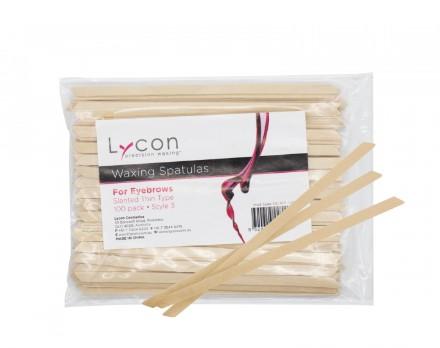 Spatule fine en bois avec un bord incliné des deux côtés. Parfaites pour modeler les sourcils avec la cire EyeBrow Lycojet de LYCON.