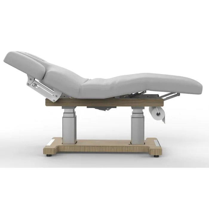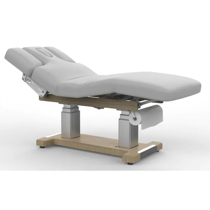 Stijlvolle en stabiele 4-motorige wellnessbank met instelbare verwarming en armdelen die weggedraaid kunnen worden. Deze wellnessbank is uitermate geschikt voor zowel schoonheids- als lichaamsbehandelingen. De licht grijze soft-cloud memory matras (samengesteld uit HR koudschuim, latex en HQ memory foam) is zacht en comfortabel en heeft een hoge dichtheid vulling. De basis is gemaakt van sterk staal. Met instelbare ‘LED Moodlights’ (diverse kleuren). Voorzien van een handbediening. Elke beweging kan op een precieze, eenvoudige en geleidelijke manier worden aangepast.