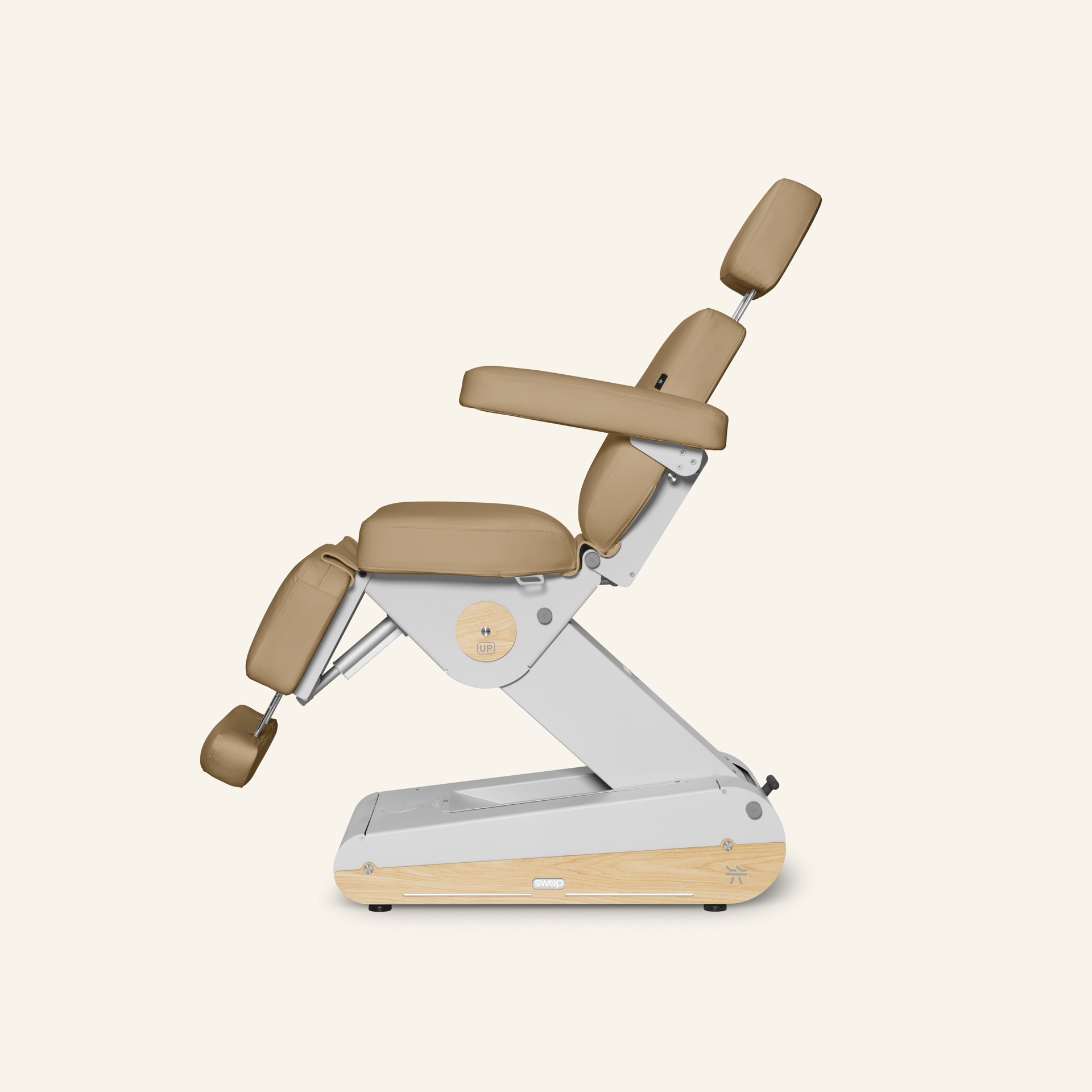 Le Swop B4 UP est un fauteuil de beauté équipé de 4 moteurs, d’un chauffage, d’une fonction de remise à zéro et de fonctions de mémoire (3 positions de mémoire). Le fauteuil est doté d’une base solide et stable (avec roulettes intégrées) et d’un rembourrage confortable. Les 4 moteurs permettent de régler facilement le dossier, le repose-pieds, la hauteur et l’inclinaison dans la position souhaitée à l’aide de la commande manuelle (incluse). Les parties de l’appui-tête et du repose-pieds peuvent être réglées en longueur afin d’obtenir un confort maximal pour le client. Les accoudoirs peuvent être repliés. Ils peuvent également être détachés.