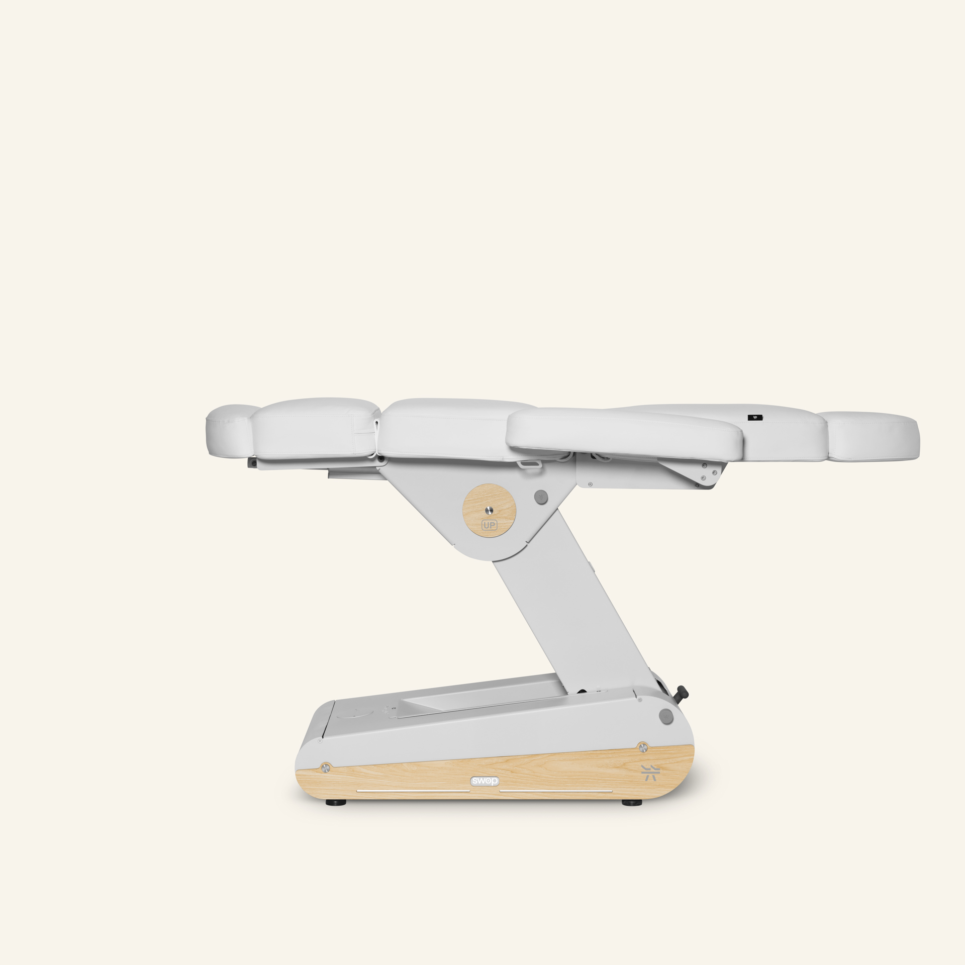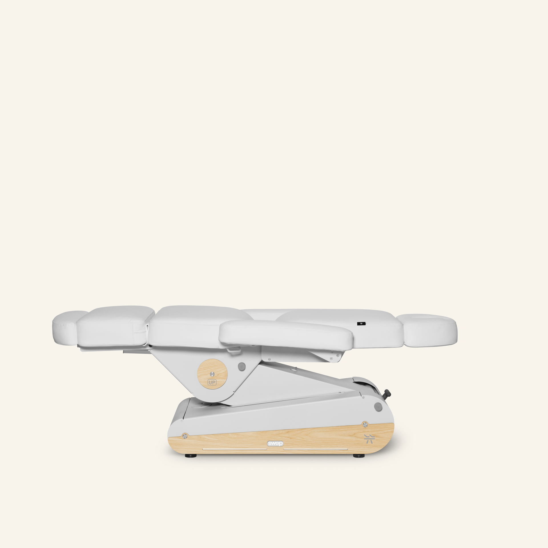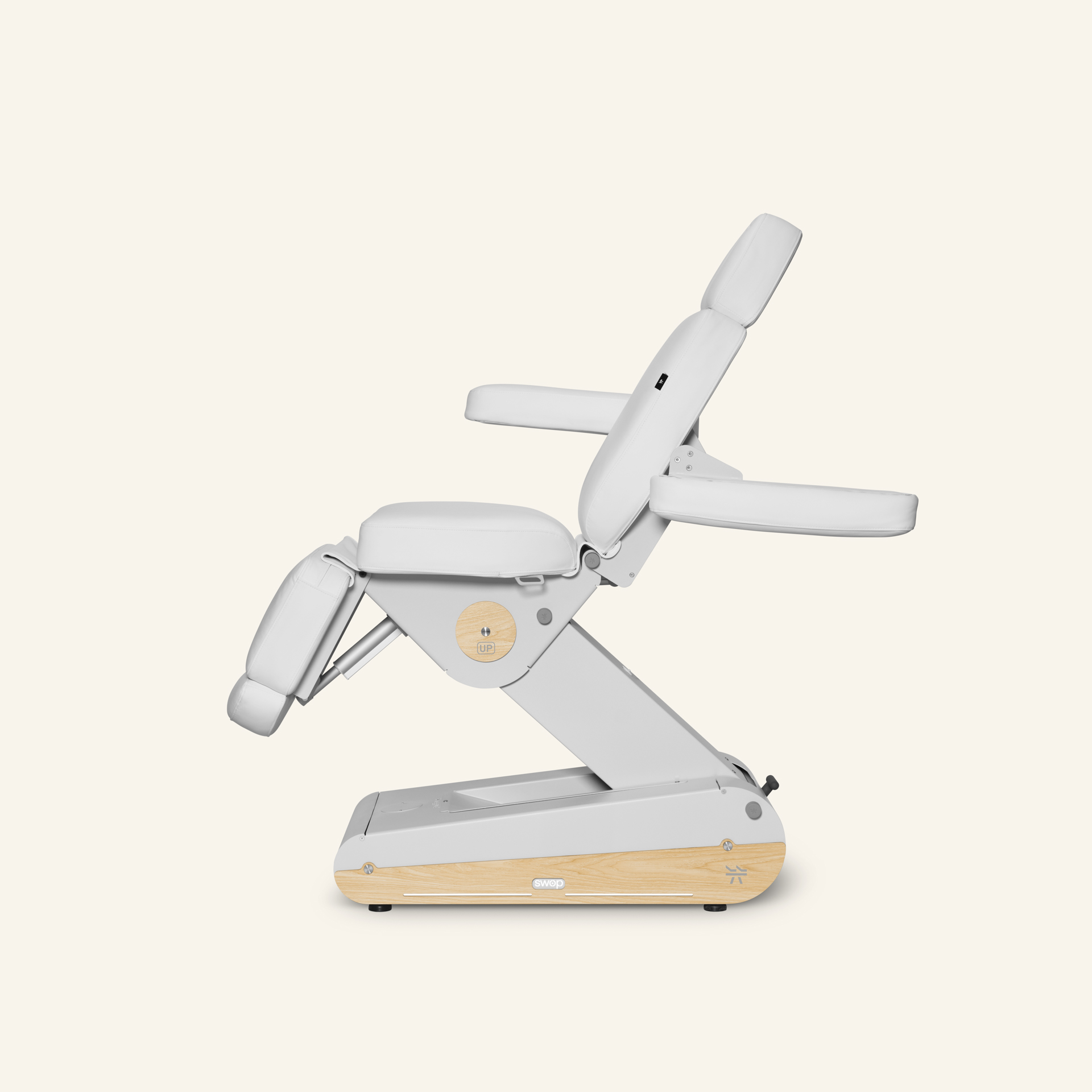 Ce fauteuil de traitement Swop est équipé d’un chauffage (réglable en 2 positions), d’une lumière LED blanche sur la base, de 3 positions de mémoire, d’une remise à zéro et d’un système à 4 roues pouvant être tournées à 360º et verrouillées et déverrouillées à l’aide d’un levier pour déplacer le fauteuil facilement et sans effort là où vous le souhaitez. La résistance à l’abrasion du cuir artificiel est de 400K et protège contre les bactéries et les rayons UV. Vous pouvez encore améliorer le fauteuil avec la lumière Cromo Mood Led. (différentes couleurs possibles) et d’un système audio en bambou (petit boîtier intégré dans le banc) qui vous permettra de diffuser de la musique relaxante pendant que vous dorlotez vos clients. Livré en standard avec des panneaux en bois clair.