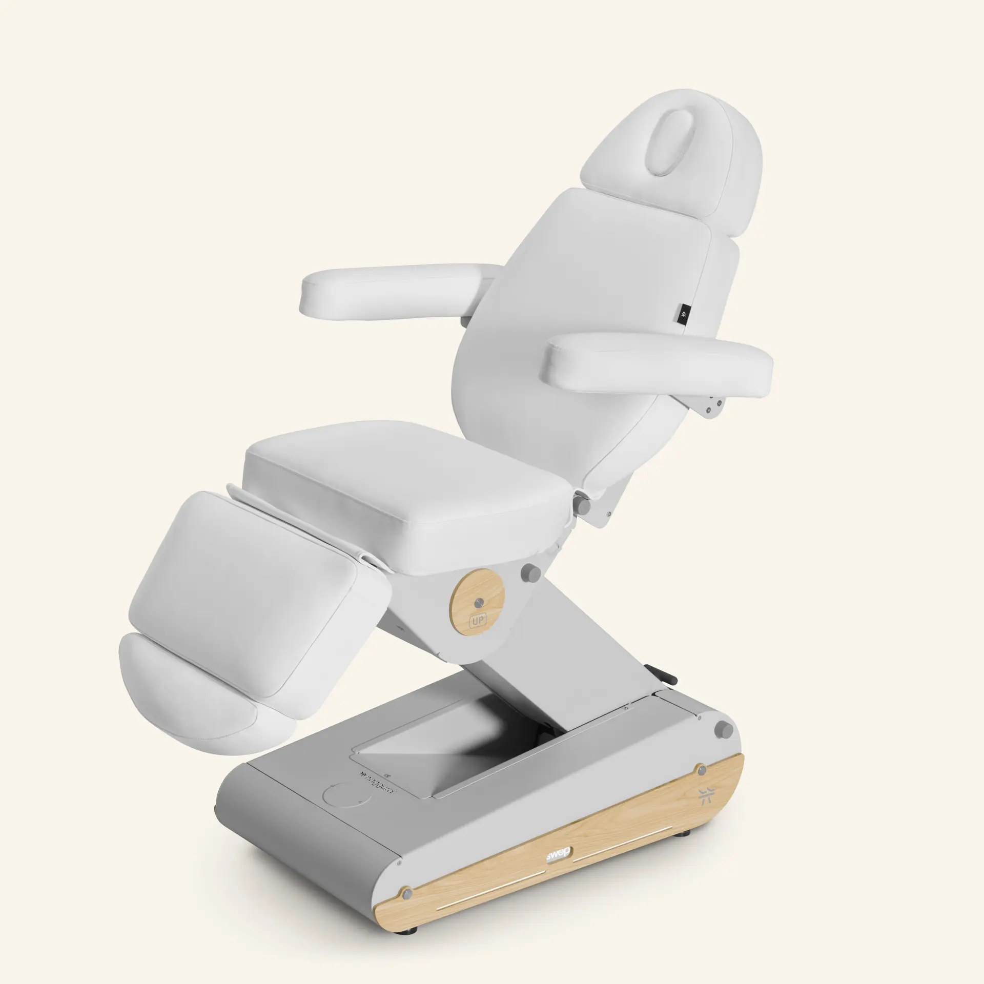 Le Swop B4 UP est un fauteuil de beauté équipé de 4 moteurs, d’un chauffage, d’une fonction de remise à zéro et de fonctions de mémoire (3 positions de mémoire). Le fauteuil est doté d’une base solide et stable (avec roulettes intégrées) et d’un rembourrage confortable. Les 4 moteurs permettent de régler facilement le dossier, le repose-pieds, la hauteur et l’inclinaison dans la position souhaitée à l’aide de la commande manuelle (incluse). Les parties de l’appui-tête et du repose-pieds peuvent être réglées en longueur afin d’obtenir un confort maximal pour le client. Les accoudoirs peuvent être repliés. Ils peuvent également être détachés.