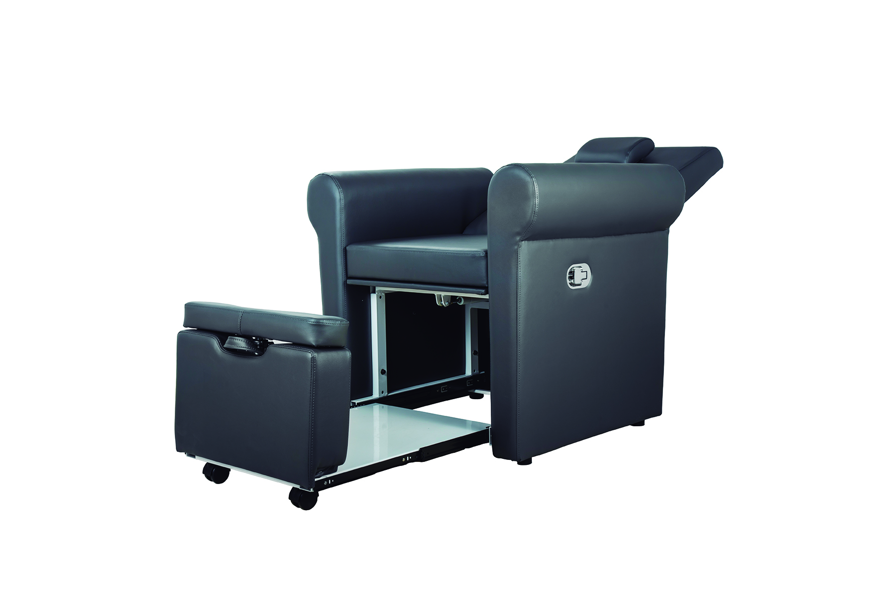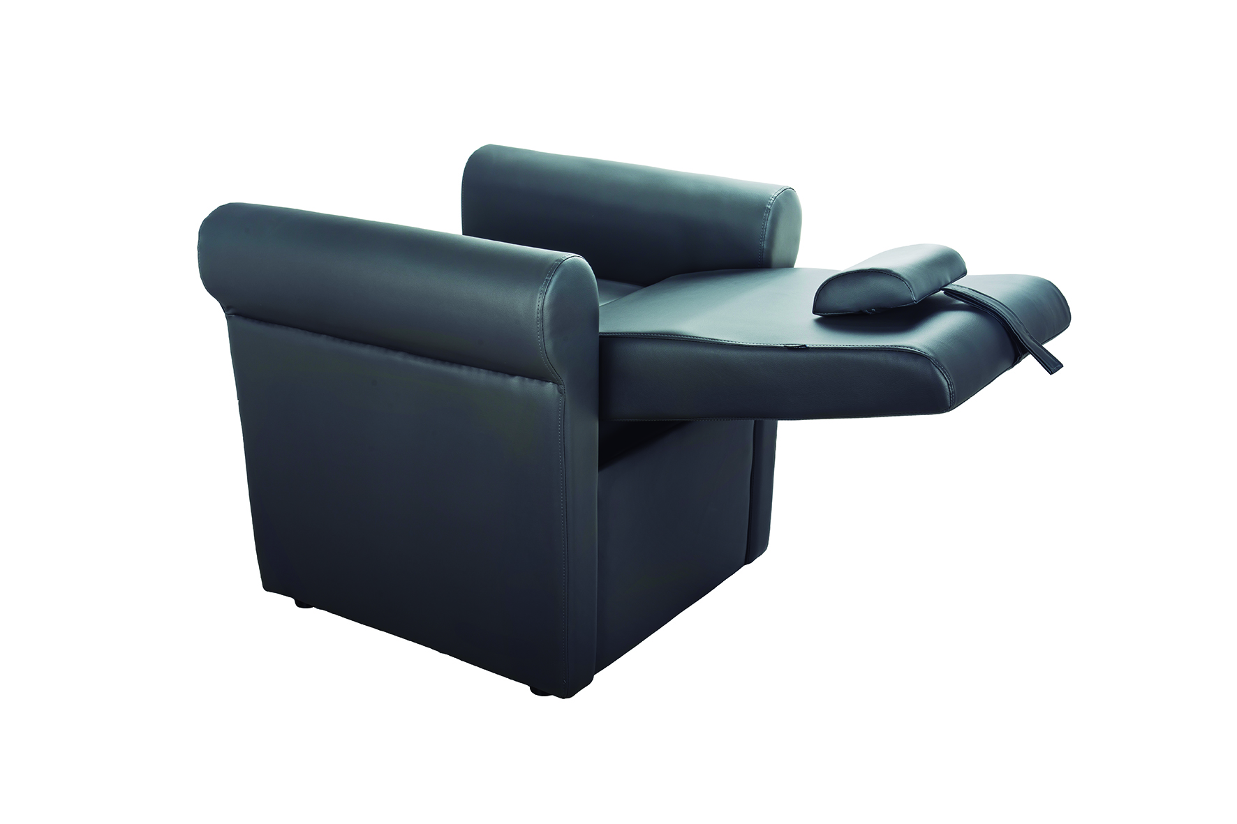 Fauteuil SPA de dessin élégant et confortable avec revêtement en PU gris de haute qualité. L’inclinaison du dossier est réglable par vérin à gaz. Logement inferieur coulissant qui permet de placer un bol à pédicure. Repose-pieds réglable.