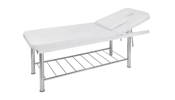 Table fixe à 2 plans avec structure chromée. Dossier réglable manuellement. Coussin repose-tête amovible avec trou visage. Revêtement en PU blanc facile à nettoyer.