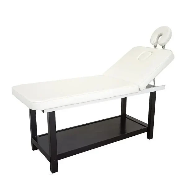 Table fixe à 2 plans avec structure en bois couleur wengé. Plate-forme inférieure pour rangement. Dossier réglable manuellement avec trou visage et têtière réglable. Revêtement blanc en PVC, facile à nettoyer.
