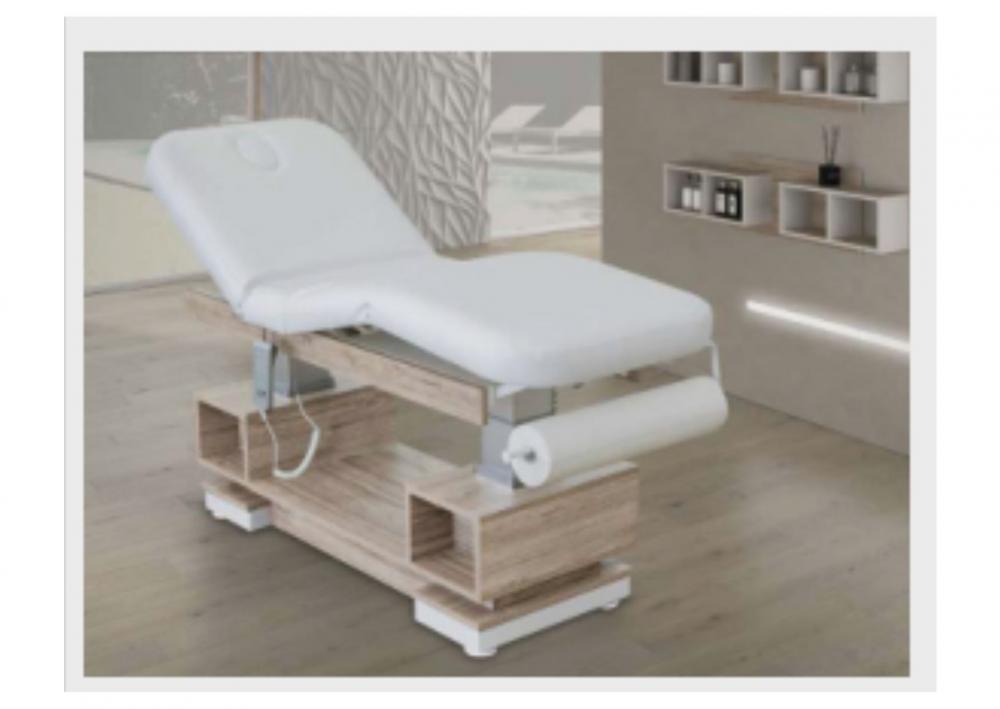 Table de massage fabriquée en Italie. . Dossier, hauteur et inclinaison de la partie des jambes ajustable grâce à des actionneurs électriques basse tension avec télécommande. Équipé d’un trou de visage et d’un porte-rouleau.