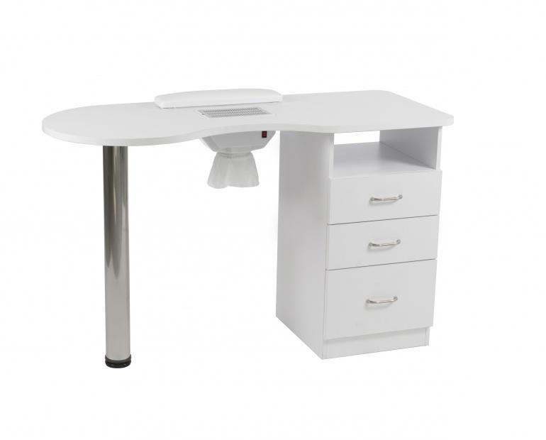 Manicuretafel in wit hout. De tafel is uitgerust met een afzuigsysteem, stofzak en manicure-kussen. Voorzien van chromen poot en kolom met 3 lades.