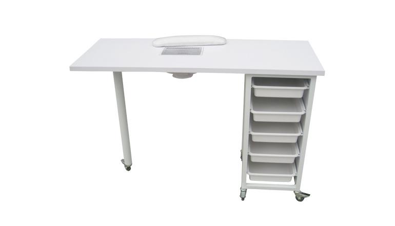 Account aanmakenManicuretafel Simple met 5 plastic schuifjes, een afzuigsysteem en manicurekussen. Met zelf-blokkerende wieltjes.