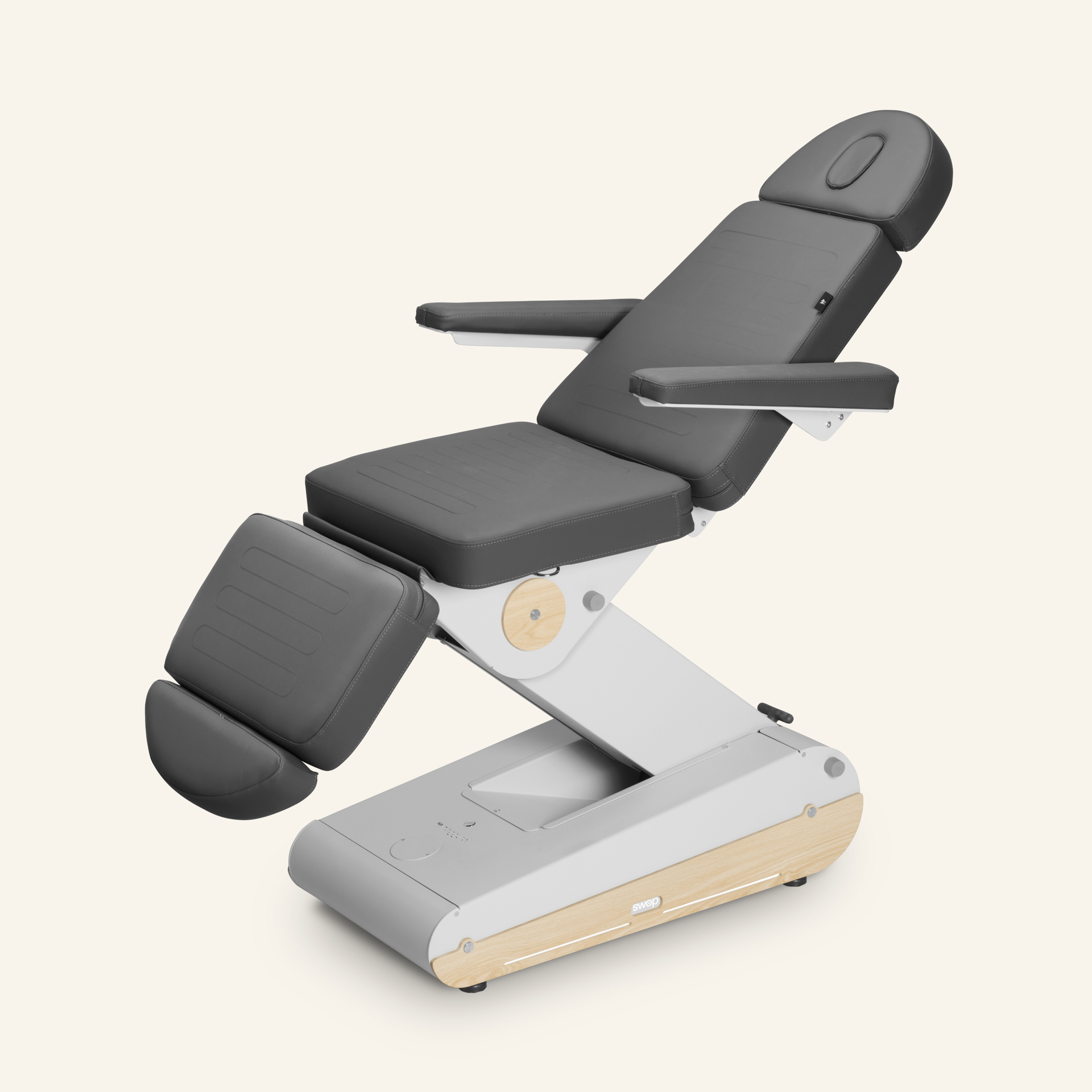 De Swop B4 Pro is een beauty stoel met 4 motoren. De stoel beschikt over een solide stabiele basis (met ingebouwde wielen). De 4 motoren maken het mogelijk de rugleuning, de voetsteun, de hoogte en de kanteling eenvoudig met de handbediening (inclusief) in de gewenste positie te verstellen. De delen van de hoofdsteun en de voetensteun kunnen in lengte worden versteld om een maximaal comfort voor de klant te verkrijgen. De armsteunen kunnen naar achteren worden geklapt. Ze kunnen ook worden losgemaakt.